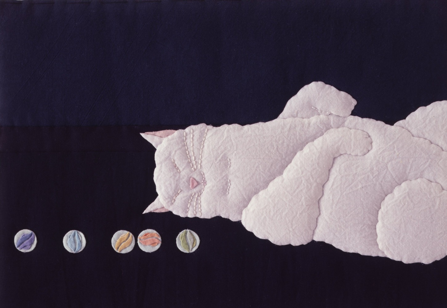 米倉健史のキルティングアートの作品は、彼が描いた線画に色番号を付した「原画」に基づき、縫製スタッフが仕上げます。その際使用される布は1m単位で丁寧に手染めされた貴重なシーチング生地で、彼が1枚1枚厳しく色をチェックした生地のみが使用されます。手染めのため大量に生産されず、また全く同じ色がなかなか出ないのが現状です。