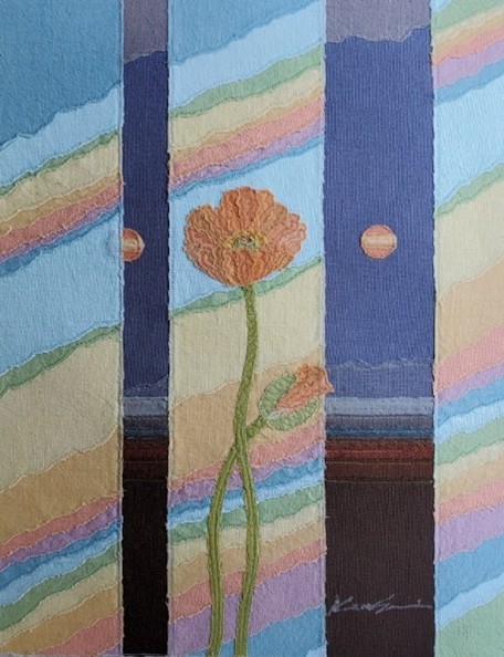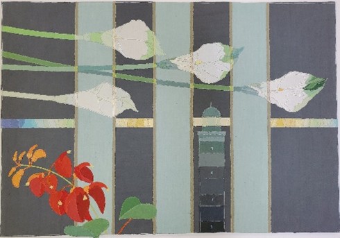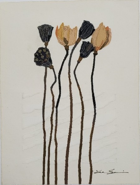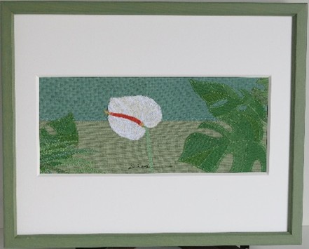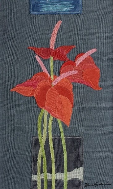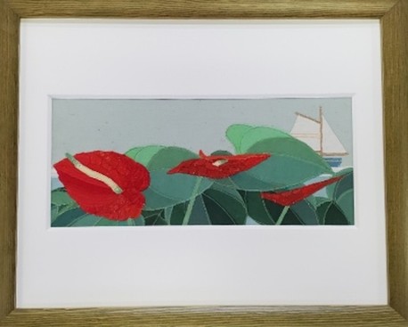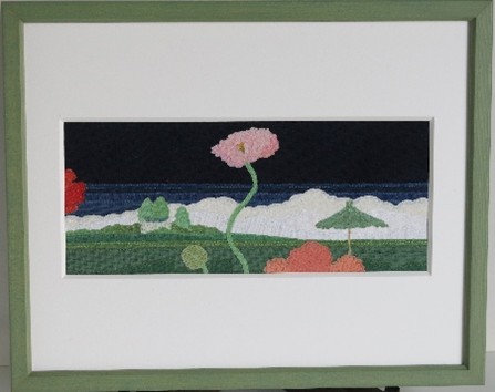 米倉健史のキルティングアートの作品は、彼が描いた線画に色番号を付した「原画」に基づき、縫製スタッフが仕上げます。その際使用される布は1m単位で丁寧に手染めされた貴重なシーチング生地で、彼が1枚1枚厳しく色をチェックした生地のみが使用されます。手染めのため大量に生産されず、また全く同じ色がなかなか出ないのが現状です。